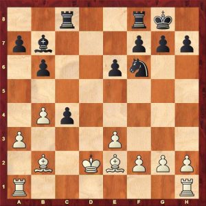 Bij het duel Delvaux versus Serruys kwam een “Nimzo-Indische” op het bord, wit had zich in de opening vergist en kwam onder zware druk te staan. Hier miste Rik een eenvoudige combinatie, zie je hem? c3