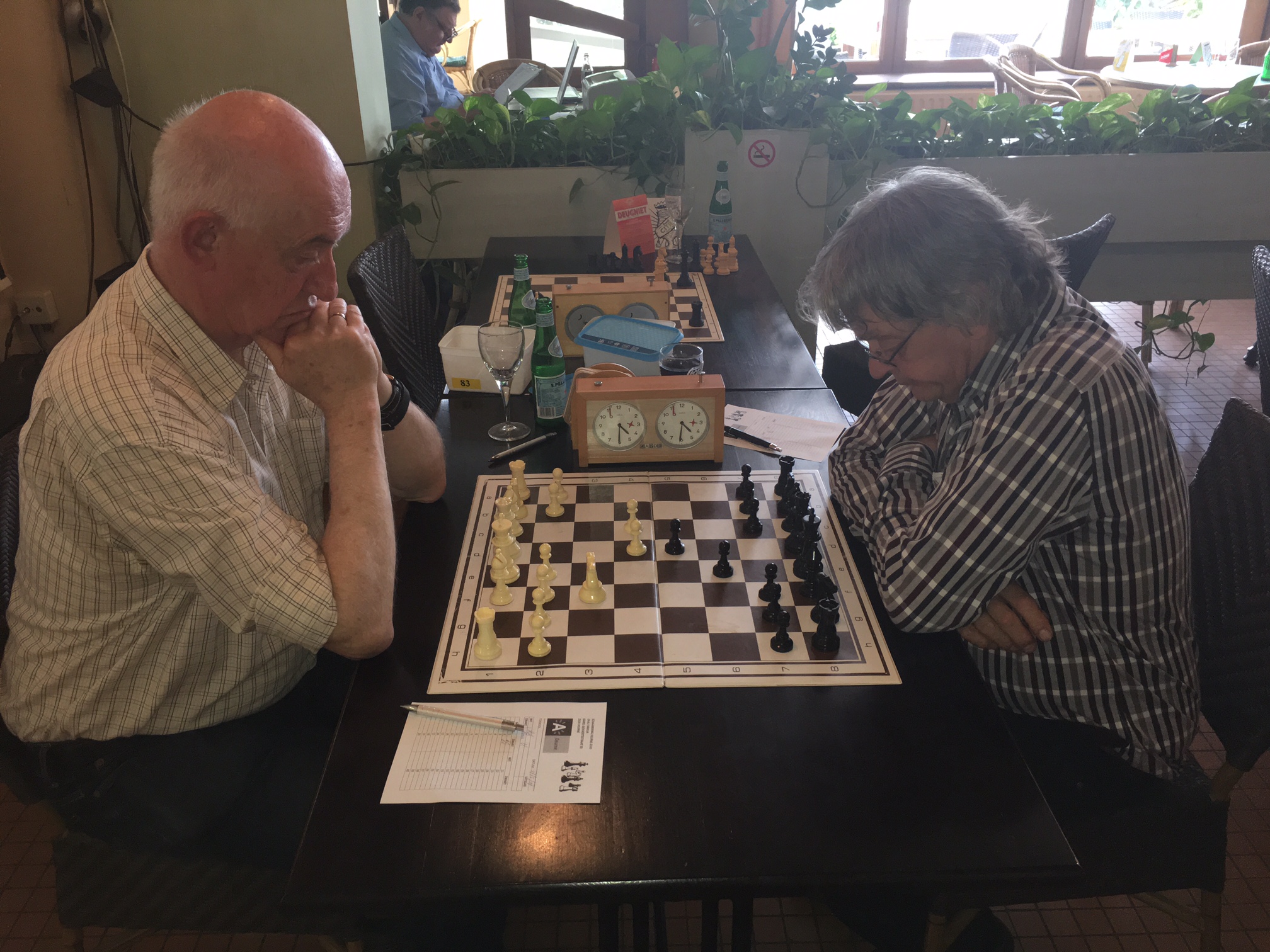 Het zeer goede weer hield de schakers van Deurne-Zuid niet tegen om te schaken ! Rudi en Erwin besloten wel om buiten te gaan spelen….